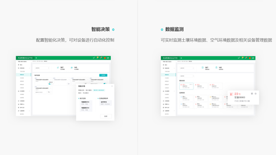 2020年公司專注于智慧農(nóng)業(yè)關(guān)鍵技術(shù)研發(fā),積極探索重慶智慧農(nóng)業(yè)發(fā)展新方向。先后服務(wù)酉陽、石柱、南川、北碚等區(qū)域客戶智慧農(nóng)業(yè)云平臺建設(shè),受到業(yè)主一致好評。公司始終堅(jiān)持“產(chǎn)品+數(shù)據(jù)+技術(shù)+服務(wù)”的發(fā)展模式,致力于智慧農(nóng)業(yè)整體解決方案研發(fā)和服務(wù)。通過數(shù)據(jù)和技術(shù)雙輪驅(qū)動,實(shí)現(xiàn)農(nóng)業(yè)規(guī)?;⒕珳?zhǔn)化、智能化。